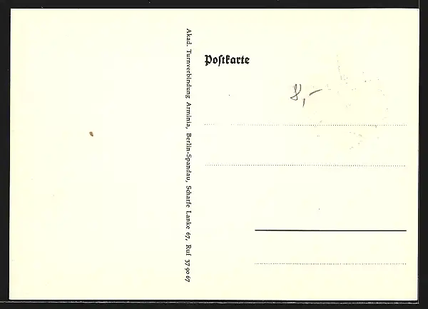 Personenbezogene Daten auf der Rückseite der Karte wurden durch blauen Textmarker unkenntlich gemacht. Die blauen Stellen sind auf die Vorderseite durchgeweicht und wirken sich negativ auf das Postkartenfoto aus
