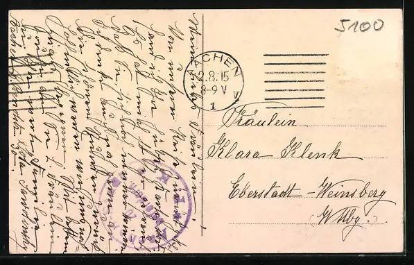 gelaufen 1915, Briefmarke entfernt, Bugspur oben li., guter Zustand