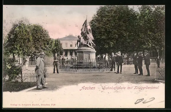 AK Aachen, Bahnhofsplatz mit Kriegerdenkmal