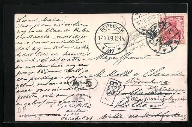 Personenbezogene Daten auf der Rückseite der Karte wurden durch blauen Textmarker unkenntlich gemacht. Die blauen Stellen sind auf die Vorderseite durchgeweicht und wirken sich negativ auf das Postkartenfoto aus