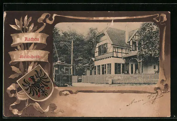 AK Aachen, Gasthaus Waldschenke, Strassenbahn, Wappen