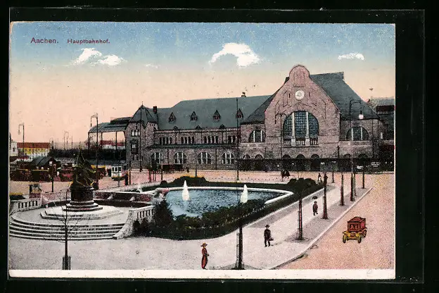 AK Aachen, Hauptbahnhof mit Springbrunnen