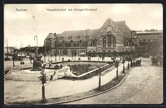 AK Aachen, Hauptbanhof mit Krieger-Denkmal