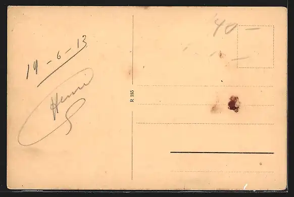 Personenbezogene Daten auf der Rückseite der Karte wurden durch blauen Textmarker unkenntlich gemacht. Die blauen Stellen sind auf die Vorderseite durchgeweicht und wirken sich negativ auf das Postkartenfoto aus