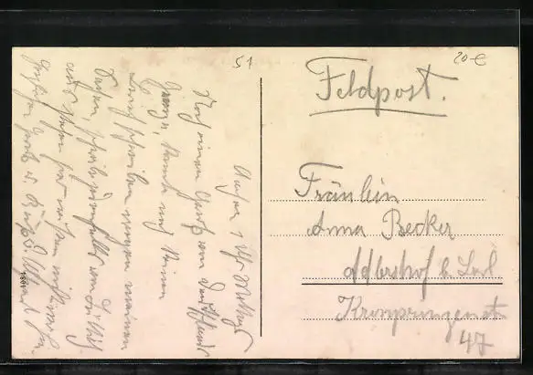 Personenbezogene Daten auf der Rückseite der Karte wurden durch blauen Textmarker unkenntlich gemacht. Die blauen Stellen sind auf die Vorderseite durchgeweicht und wirken sich negativ auf das Postkartenfoto aus