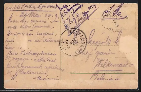 alte Ansichtskarte, gelaufen 1919, Ecken bestoßen, rückseitig Oberflächenschaden, guter Zustand