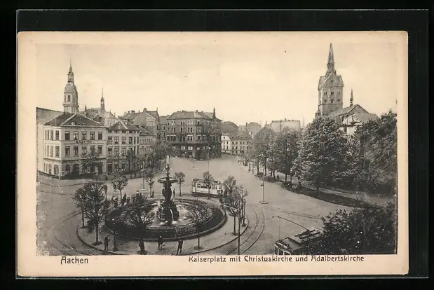 AK Aachen, Kaiserplatz mit Christuskirche, Adalbertskirche und Strassenbahn