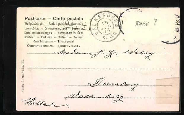 gelaufen 1904, Briefmarke entfernt, rückseitig Oberflächenschaden, restaurierter Einriss li. unten, guter Zustand