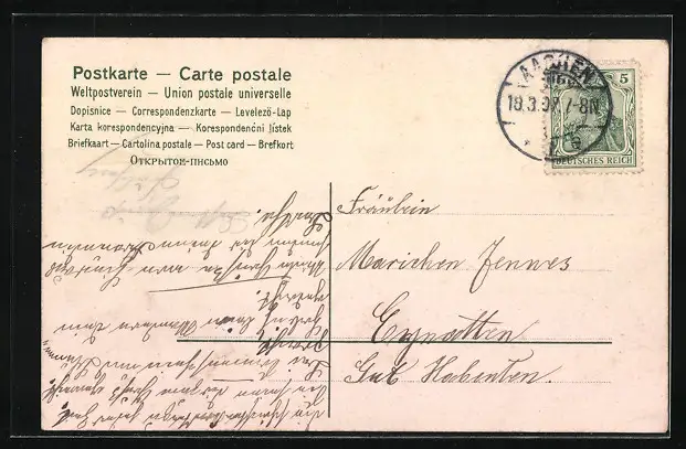 Personenbezogene Daten auf der Rückseite der Karte wurden durch blauen Textmarker unkenntlich gemacht. Die blauen Stellen sind auf die Vorderseite durchgeweicht und wirken sich negativ auf das Postkartenfoto aus