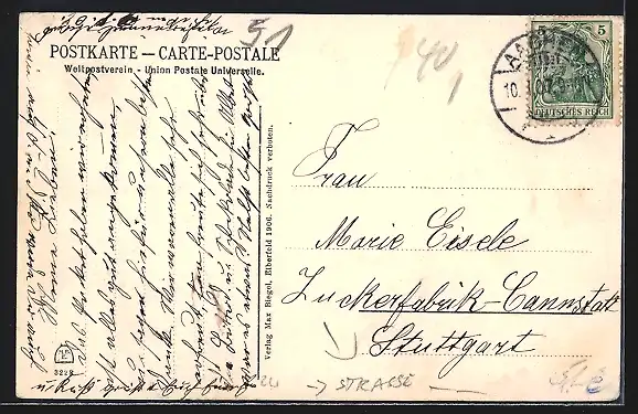 gelaufen 1907, Eckknicke li. unten, guter Zustand