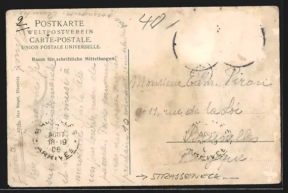 gelaufen 1906, Briefmarke entfernt, rückseitig Oberflächenschaden, guter Zustand