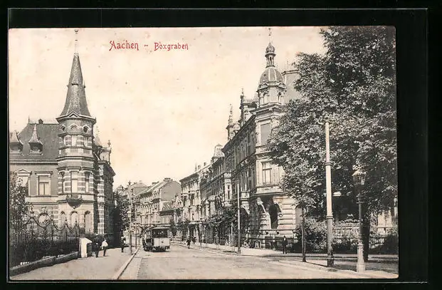 AK Aachen, Strassenpartie am Boxgraben mit Strassenbahn