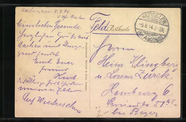 gelaufen als Feldpost 1914, guter Zustand