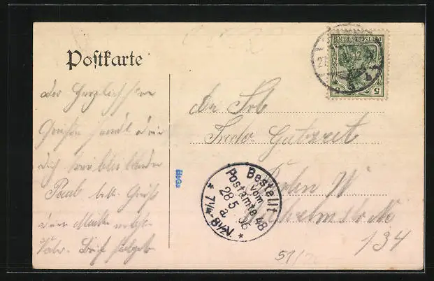 alte Ansichtskarte, gelaufen 1906, Eckknicke li., guter Zustand