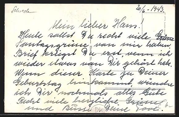 Personenbezogene Daten auf der Rückseite der Karte wurden durch blauen Textmarker unkenntlich gemacht. Die blauen Stellen sind auf die Vorderseite durchgeweicht und wirken sich negativ auf das Postkartenfoto aus