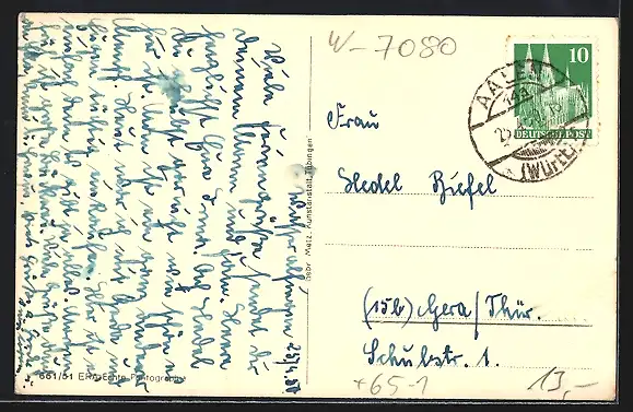 Personenbezogene Daten auf der Rückseite der Karte wurden durch blauen Textmarker unkenntlich gemacht. Die blauen Stellen sind auf die Vorderseite durchgeweicht und wirken sich negativ auf das Postkartenfoto aus