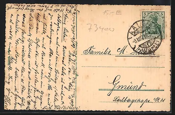 Personenbezogene Daten auf der Rückseite der Karte wurden durch blauen Textmarker unkenntlich gemacht. Die blauen Stellen sind auf die Vorderseite durchgeweicht und wirken sich negativ auf das Postkartenfoto aus