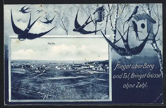AK Aalen, Teilansicht, Schwalben an Vogelhäusern, Passepartout