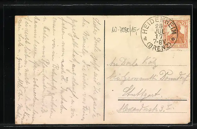 gelaufen 1917, leicht fleckig, minimaler Eckschaden li. unten, guter Zustand