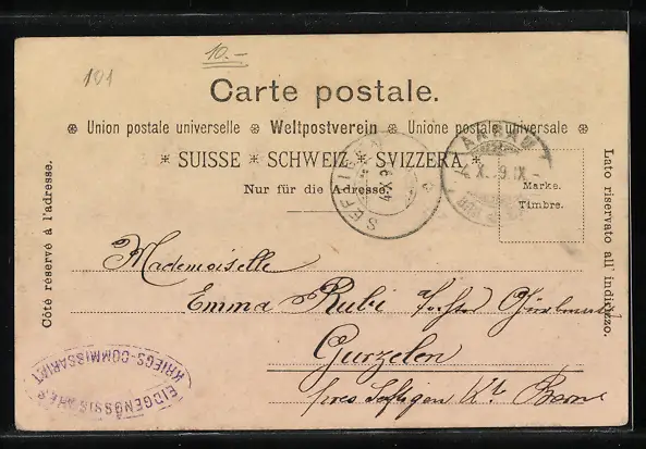 Personenbezogene Daten auf der Rückseite der Karte wurden durch blauen Textmarker unkenntlich gemacht. Die blauen Stellen sind auf die Vorderseite durchgeweicht und wirken sich negativ auf das Postkartenfoto aus