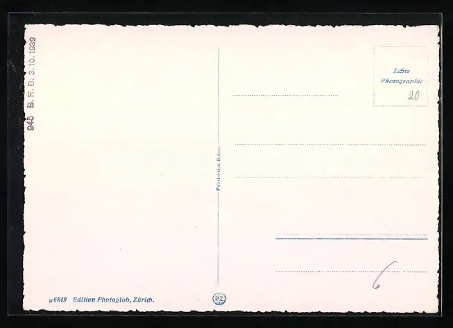 Personenbezogene Daten auf der Rückseite der Karte wurden durch blauen Textmarker unkenntlich gemacht. Die blauen Stellen sind auf die Vorderseite durchgeweicht und wirken sich negativ auf das Postkartenfoto aus