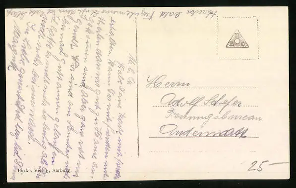 Personenbezogene Daten auf der Rückseite der Karte wurden durch blauen Textmarker unkenntlich gemacht. Die blauen Stellen sind auf die Vorderseite durchgeweicht und wirken sich negativ auf das Postkartenfoto aus