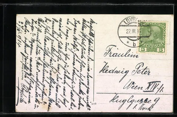Personenbezogene Daten auf der Rückseite der Karte wurden durch blauen Textmarker unkenntlich gemacht. Die blauen Stellen sind auf die Vorderseite durchgeweicht und wirken sich negativ auf das Postkartenfoto aus