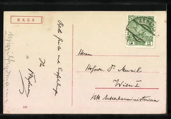 Personenbezogene Daten auf der Rückseite der Karte wurden durch blauen Textmarker unkenntlich gemacht. Die blauen Stellen sind auf die Vorderseite durchgeweicht und wirken sich negativ auf das Postkartenfoto aus