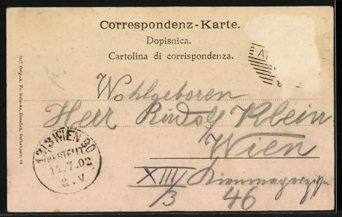 alte Ansichtskarte, gelaufen 1902, Briefmarke entfernt, rückseitig Oberflächenschaden, guter Zustand