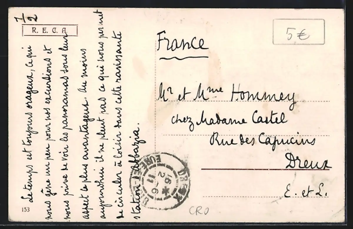 Personenbezogene Daten auf der Rückseite der Karte wurden durch blauen Textmarker unkenntlich gemacht. Die blauen Stellen sind auf die Vorderseite durchgeweicht und wirken sich negativ auf das Postkartenfoto aus