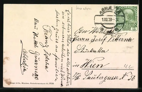 Personenbezogene Daten auf der Rückseite der Karte wurden durch blauen Textmarker unkenntlich gemacht. Die blauen Stellen sind auf die Vorderseite durchgeweicht und wirken sich negativ auf das Postkartenfoto aus