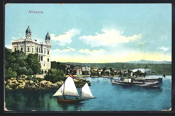AK Abbazia, Teilansicht mit Dampfschiff und Segelboot
