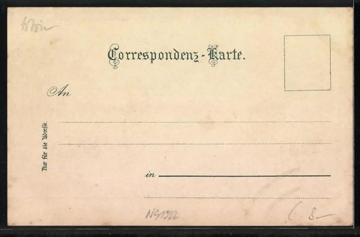 Personenbezogene Daten auf der Rückseite der Karte wurden durch blauen Textmarker unkenntlich gemacht. Die blauen Stellen sind auf die Vorderseite durchgeweicht und wirken sich negativ auf das Postkartenfoto aus