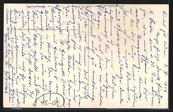 Personenbezogene Daten auf der Rückseite der Karte wurden durch blauen Textmarker unkenntlich gemacht. Die blauen Stellen sind auf die Vorderseite durchgeweicht und wirken sich negativ auf das Postkartenfoto aus
