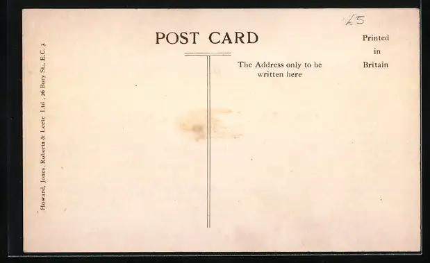 Personenbezogene Daten auf der Rückseite der Karte wurden durch blauen Textmarker unkenntlich gemacht. Die blauen Stellen sind auf die Vorderseite durchgeweicht und wirken sich negativ auf das Postkartenfoto aus