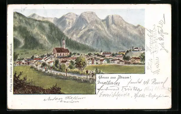 AK Absam, Ortsansicht mit Berglandschaft