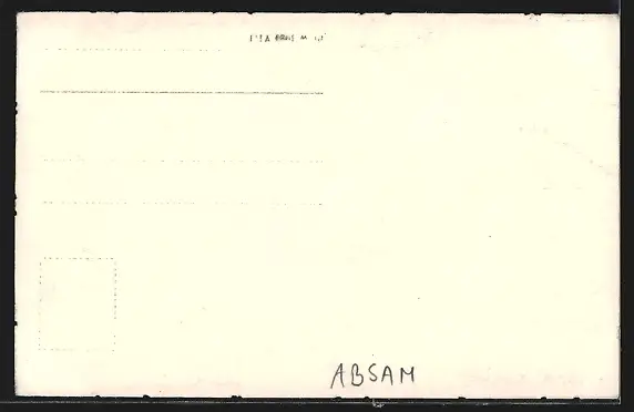 Personenbezogene Daten auf der Rückseite der Karte wurden durch blauen Textmarker unkenntlich gemacht. Die blauen Stellen sind auf die Vorderseite durchgeweicht und wirken sich negativ auf das Postkartenfoto aus