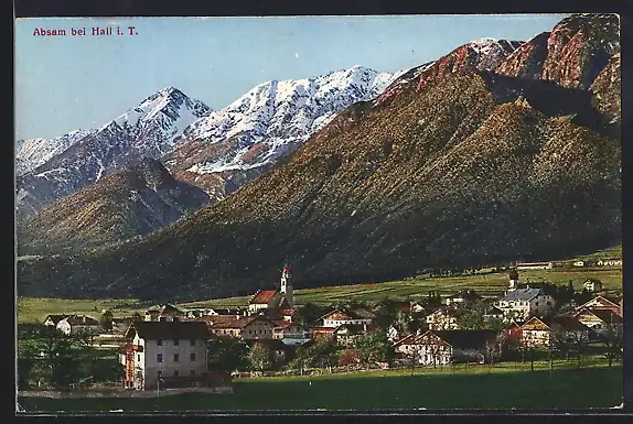 AK Absam bei Hall, Ortsansicht mit Bergpanorama