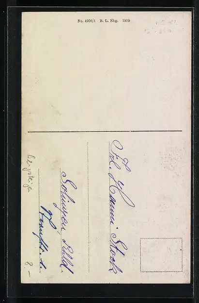 Personenbezogene Daten auf der Rückseite der Karte wurden durch blauen Textmarker unkenntlich gemacht. Die blauen Stellen sind auf die Vorderseite durchgeweicht und wirken sich negativ auf das Postkartenfoto aus