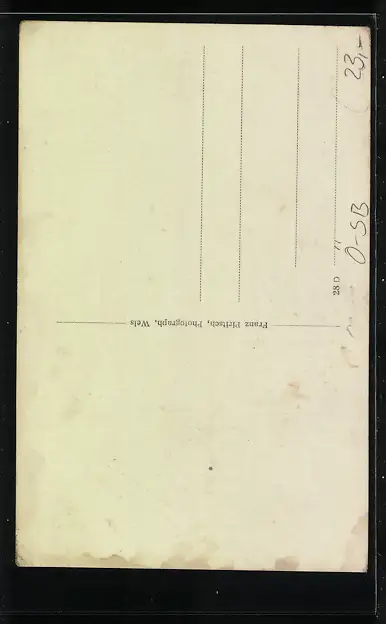 Personenbezogene Daten auf der Rückseite der Karte wurden durch blauen Textmarker unkenntlich gemacht. Die blauen Stellen sind auf die Vorderseite durchgeweicht und wirken sich negativ auf das Postkartenfoto aus