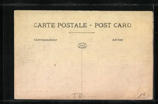 Personenbezogene Daten auf der Rückseite der Karte wurden durch blauen Textmarker unkenntlich gemacht. Die blauen Stellen sind auf die Vorderseite durchgeweicht und wirken sich negativ auf das Postkartenfoto aus