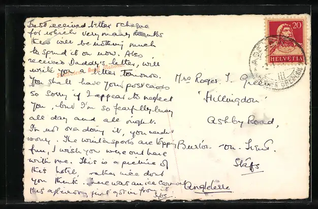 Personenbezogene Daten auf der Rückseite der Karte wurden durch blauen Textmarker unkenntlich gemacht. Die blauen Stellen sind auf die Vorderseite durchgeweicht und wirken sich negativ auf das Postkartenfoto aus