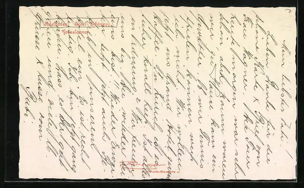 Personenbezogene Daten auf der Rückseite der Karte wurden durch blauen Textmarker unkenntlich gemacht. Die blauen Stellen sind auf die Vorderseite durchgeweicht und wirken sich negativ auf das Postkartenfoto aus