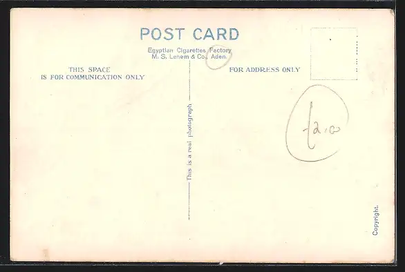 Personenbezogene Daten auf der Rückseite der Karte wurden durch blauen Textmarker unkenntlich gemacht. Die blauen Stellen sind auf die Vorderseite durchgeweicht und wirken sich negativ auf das Postkartenfoto aus