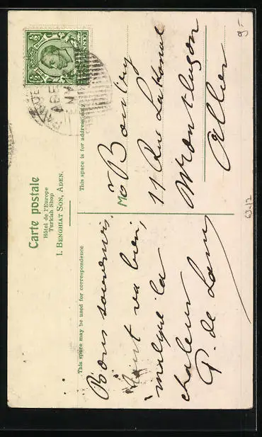 Personenbezogene Daten auf der Rückseite der Karte wurden durch blauen Textmarker unkenntlich gemacht. Die blauen Stellen sind auf die Vorderseite durchgeweicht und wirken sich negativ auf das Postkartenfoto aus
