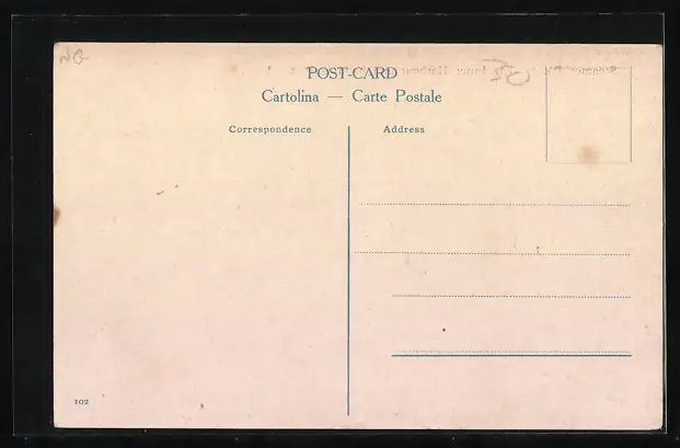 Personenbezogene Daten auf der Rückseite der Karte wurden durch blauen Textmarker unkenntlich gemacht. Die blauen Stellen sind auf die Vorderseite durchgeweicht und wirken sich negativ auf das Postkartenfoto aus