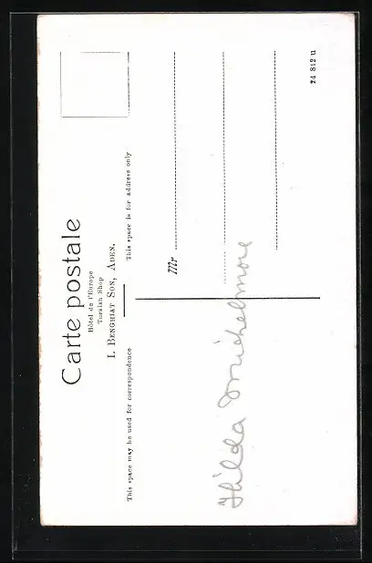 Personenbezogene Daten auf der Rückseite der Karte wurden durch blauen Textmarker unkenntlich gemacht. Die blauen Stellen sind auf die Vorderseite durchgeweicht und wirken sich negativ auf das Postkartenfoto aus