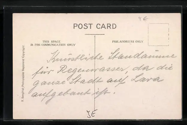 Personenbezogene Daten auf der Rückseite der Karte wurden durch blauen Textmarker unkenntlich gemacht. Die blauen Stellen sind auf die Vorderseite durchgeweicht und wirken sich negativ auf das Postkartenfoto aus