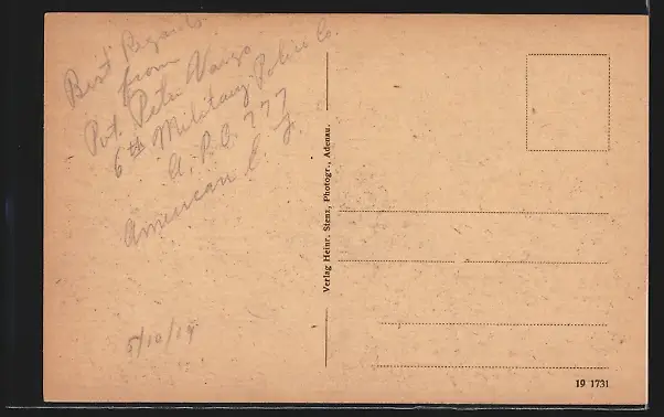 Personenbezogene Daten auf der Rückseite der Karte wurden durch blauen Textmarker unkenntlich gemacht. Die blauen Stellen sind auf die Vorderseite durchgeweicht und wirken sich negativ auf das Postkartenfoto aus