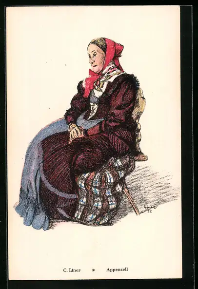 AK Ältere Frau in Appenzeller Tracht mit rotem Kopftuch, auf einem Stuhl sitzend